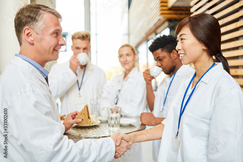 Oberarzt begrüßt Medizin Studentin mit handshake