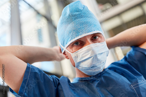 Oberarzt als Chirurg mit Haube setzt seinen Mundschutz auf