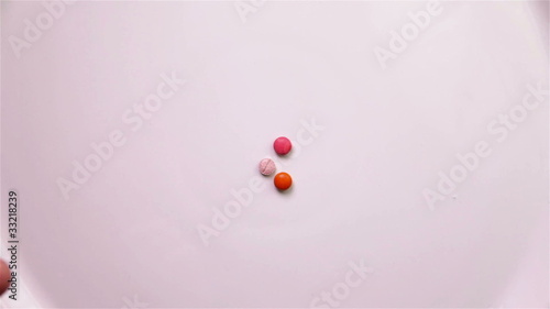 Big pills on pile of colourful medication pills rotating in a seamless loop