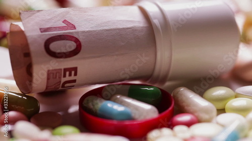 Closeup of pile of pills in blisters rotating counterclockwise in a loop