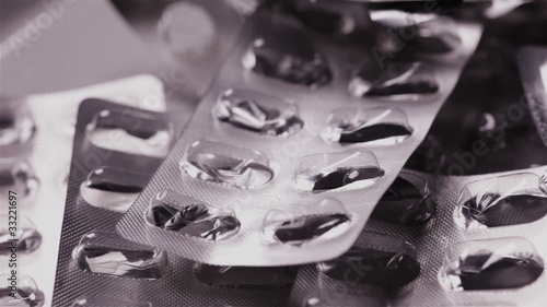 Closeup of pile of pills in blisters rotating counterclockwise in a loop
