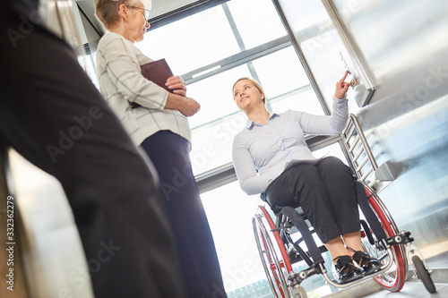 Frau im Rollstuhl im behindertengerechten Bürohaus
