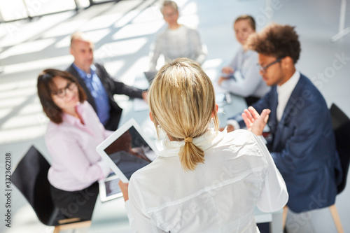Business Leute und Referent nach Vortrag in einer Diskussion
