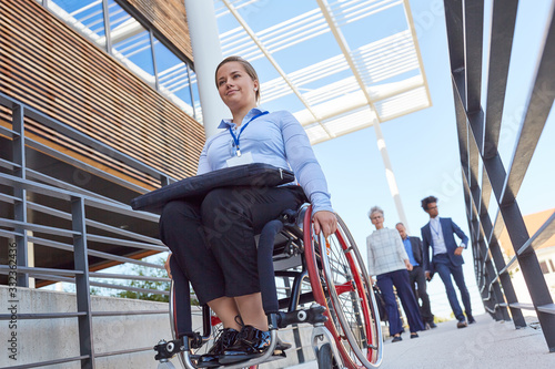 Frau im Rollstuhl vor dem Büro auf einer Rampe