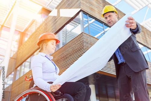 Ingenieur mit Bauplan und Frau als Architekt im Rollstuhl