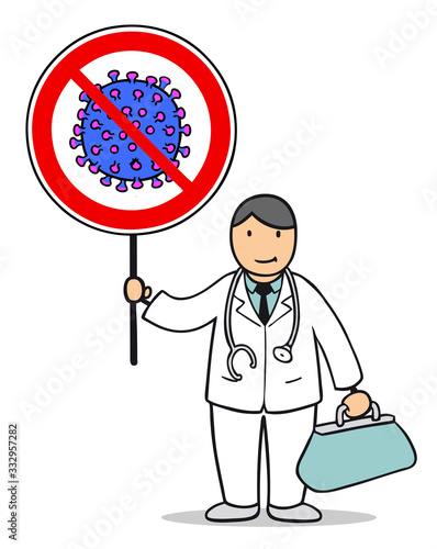 Cartoon Arzt mit Mundschutz hält Coronavirus Verbotsschild