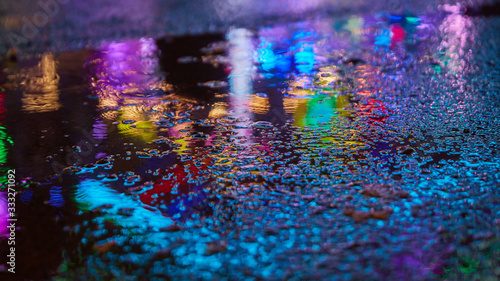 Pfütze nachts bei Regen auf Jahrmarkt oder Kirmes