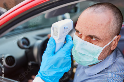 Fieber messen an Stirn bei Covid-19 Patientin in Klinik