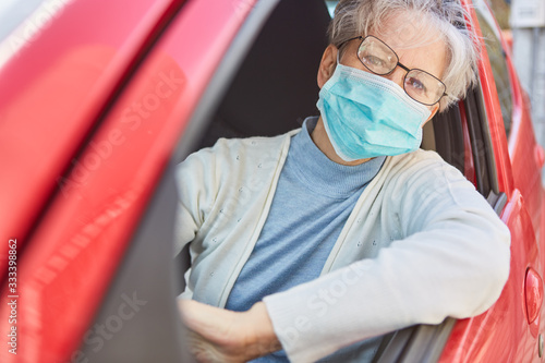 Seniorin mit Mundschutz beim Auto fahren als Risikogruppe