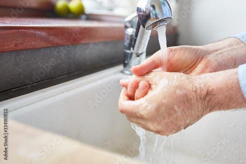 Seniorin beim Händewaschen mit Seife unter Wasser