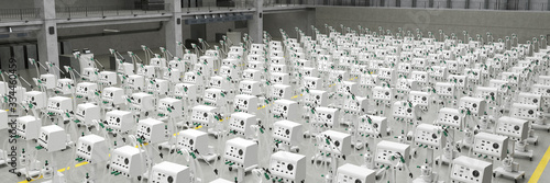 Lots of new ventilators and respirators in the warehouse of a coronavirus epidemic factory (3D Rendering)