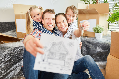 Familie mit Bild vom Eigenheim freut sich