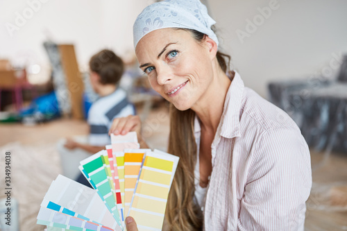 Frau als Heimwerker mit Auswahl an Wandfarbe