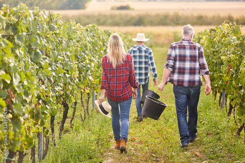 Drei Erntehelfer bei der Weinernte im Weinberg