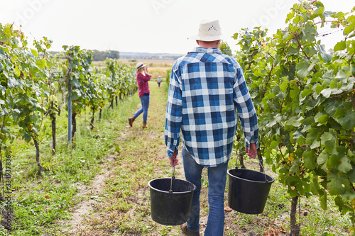 Winegrowers or harvest workers in the vineyard