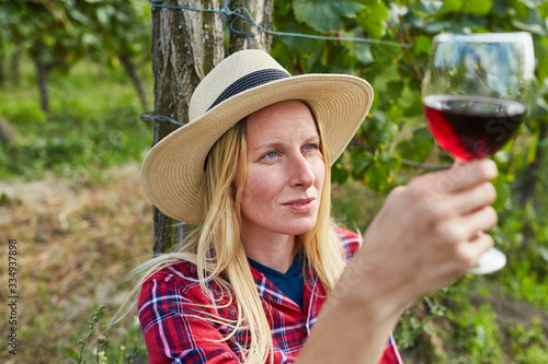 Weinbauer mit Glas Rotwein prüft das Bouquet