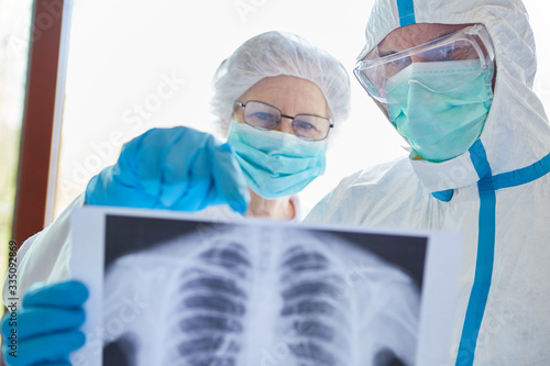 Mediziner mit Röntgenbild eines Covid-19 Patienten