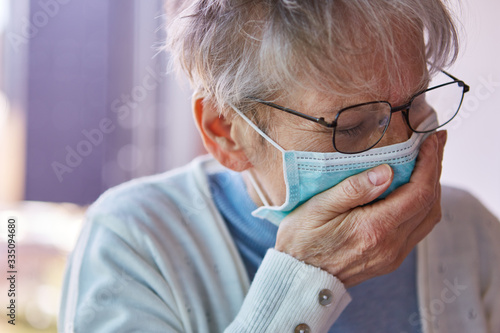 Seniorin mit Mundschutz beim Husten in Armbeuge