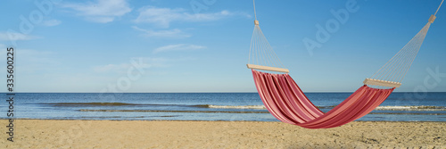Empty red hammock on the beach by the sea in summer (3D Rendering)