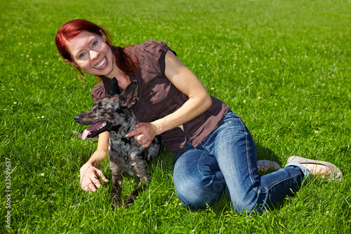 Lachende Frau streichelt Hund im Gras