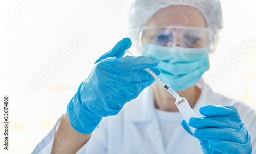 Forscher mit Spritze mit Impfstoff gegen Covid-19