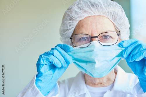Alte Ärztin in Schutzkleidung setzt Mundschutz auf