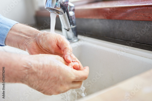 Seniorin beim Händewaschen mit Seife unter Wasser