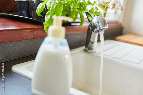 Flüssigseife neben Wasserhahn mit Wasser in Küche