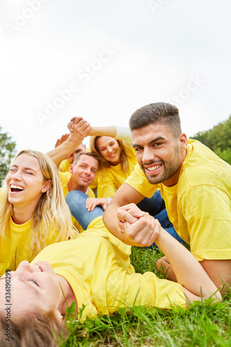 Sieger Mannschaft mit Pokal jubelt bei Teambuilding Event