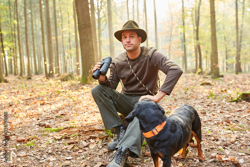 Förster mit Jagdhund und Fernglas macht Pause