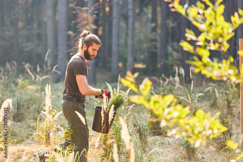 Waldarbeiter pflanzt Bäume zur Aufforstung