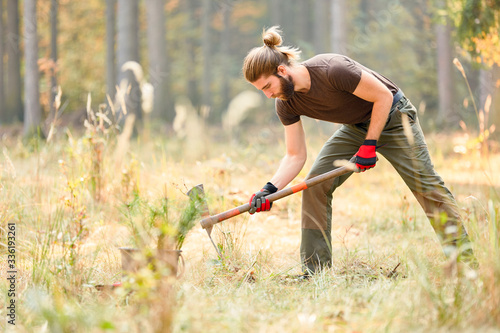 Waldarbeiter buddelt ein Pflanzloch für Setzlinge