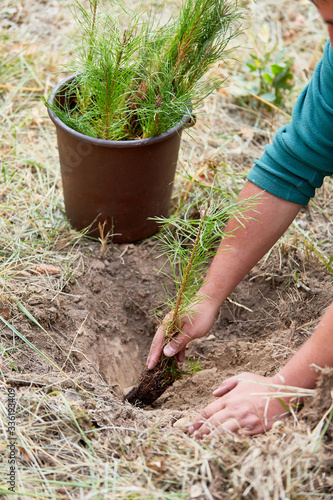 Hand plants pine seedlings in nursery