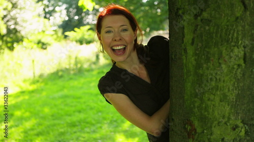 Happy woman hiding behind tree