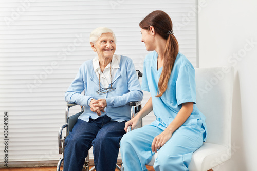Alte Seniorin im Rollstuhl mit Frau vom Pflegedienst