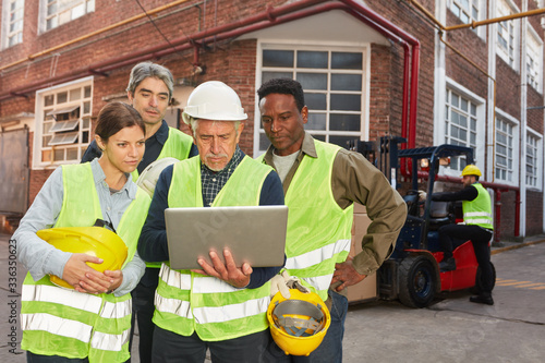 Industrie Arbeiter Team mit Computer vor Fabrik