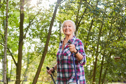 Zufrieden lächelnde Seniorin beim Nordic Walking
