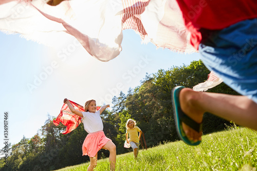 Gruppe Kinder beim Rennen in der Natur im Sommer