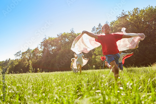 Kinder laufen mit Tüchern über eine Wiese