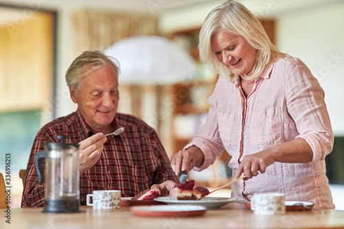 Seniorin schneidet ein Stück Kuchen beim Kaffeetrinken
