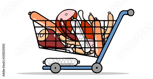Viel Fleisch und Wurst in Einkaufswagen beim Metzger