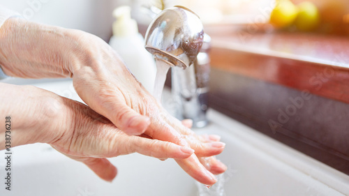 Elderly woman washing hands with soap and water
