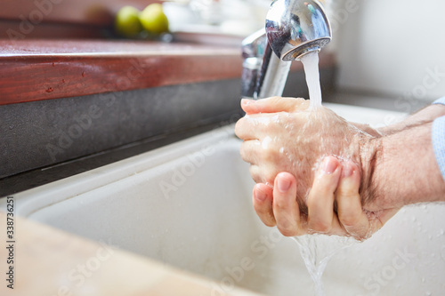 Seniorin wäscht ihre Hände mit Wasser und Seife