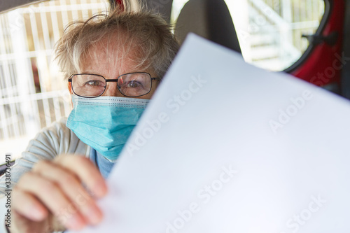 Seniorin mit Mundschutz erhält Coronavirus Information