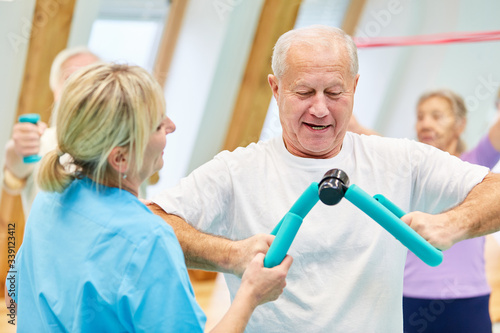 Therapeutin betreut Senior beim Hanteltraining