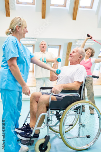 Krankenschwester vor Gruppe Senioren im Pflegeheim