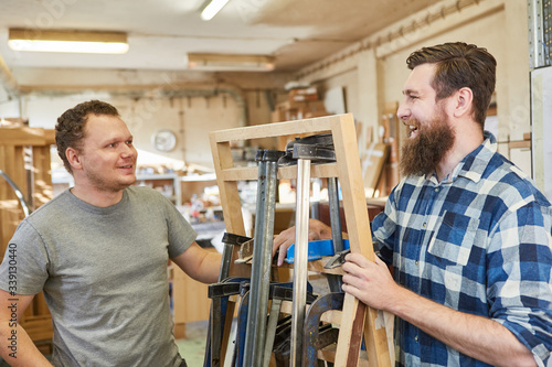 Zwei Möbelbauer mit Holz Möbel Werkstück