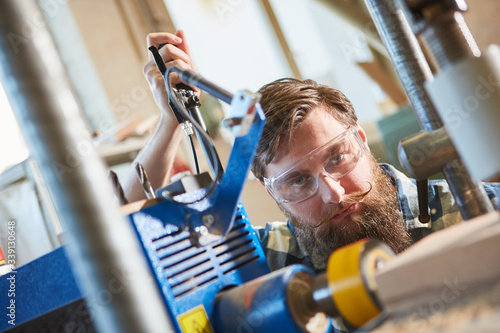 Schreiner Lehrling mit Schutzbrille in Schreinerei