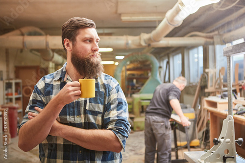 Self-employed hipster carpenter drinking coffee