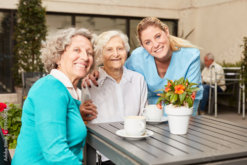 Seniorin trinkt Kaffee mit Besuch und Pflegekraft